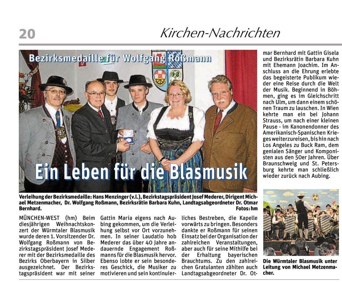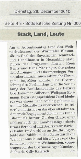 In der Süddeutschen Zeitung vom 28. Dezember 2010 fand sich ein kleiner Bericht. Auf der Webseite des Münchner Wochenanzeigers findet sich ein Artikel mit Bild von der Ehrung. Auch in der Stadtteilzeitung "Hallo Aubing" findet sich ein Artikel, dort zusätzlich mit einem Bild der Musikkapelle während des Konzertes. Auf Papier sahen die Artikel im Münchner Wochenanzeiger und "Hallo Aubing" so aus.